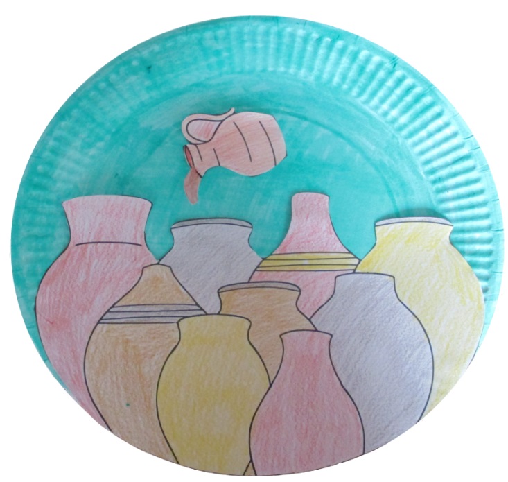 Ook deze knutsel hoort bij het verhaal van Elisa en de weduwe met de zonen die tot slaaf gemaakt zullen worden omdat zij een schulden had. Het verhaal is te vinden in 2 Koningen 4. Elisa geeft opdracht om zoveel mogelijk kruiken bij de buren te halen en die te vullen. Ik ben er zelf vanuit gegaan dat ook zij een schenkkruikje had waarmee zij de olie schonk. Ik heb in dit geval een papieren bordje als achtergrond gebruikt en daar de kruiken voor geplakt. Ik heb overigens nog een knutsel met dezelfde kruiken, maar dan ook de onderzijde recht zodat het op een A4 gemaakt kan worden. Doordat mijn printer het begaf was ik wat laat met plaatsen, maar ik probeer nu weer wat dingen erop te zetten.